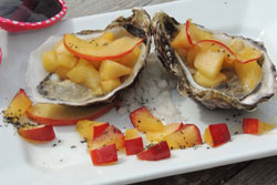 Ouvrir les huîtres, enlever l’eau, les décrocher. Répartir les pommes infusées dans les coquilles. Placer les dans l’assiette, sur un lit de sel pour les caler. Entourer des cubes caramélisés avec un filet de sirop. Glisser quelques secondes sous le grill du four, servir chaud. On dévore des yeux et ensuite on se régale !