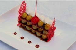 Découpez dans la pâte feuilletée 6 rectangles de 2cm x 5cm. Cuire ces rectangles entre 2 plaques au four 160°c pendant 15 min. Sortir du four et saupoudrez le dessus des rectangles avec du sucre glace et les mettre à caraméliser au gril pendant 3 à 4 min.