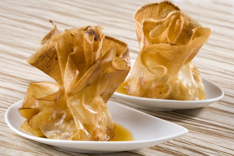 Badigeonner une feuille de brick de beurre fondu et la parsemer de sucre glace. Disposer ensuite au centre les dés de pommes, les abricots. Parsemer le tout d’amandes effilées et de raisins secs, puis arroser de marsala.