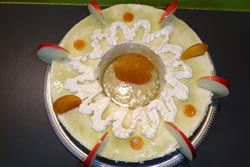 Détailler des lamelles de pommes Ariane et les disposer sur les pourtours de l’entremet. Mettre dans une poche à douille la ganache montée et finaliser la présentation.