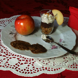 Au moment de servir, finir de dresser les verrines avec l’espuma de pommes, parsemer de quelques miettes de crumble sur le dessus et servir avec vos blinis.