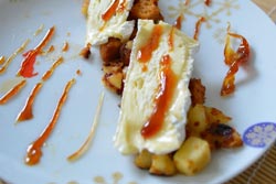Mettre quelques gouttes de caramel sur les tranches de fromage.