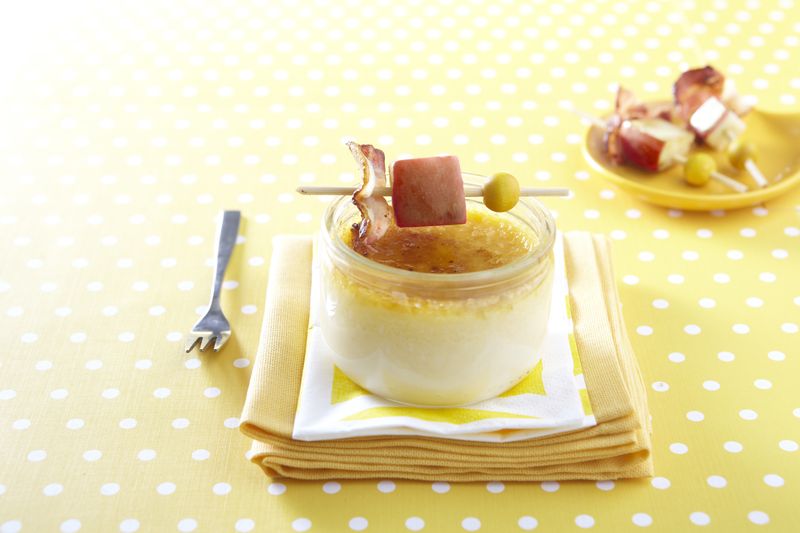 Poser chaque petite crème dans une assiette. Dresser délicatement une brochette chaude sur le côté du pot.