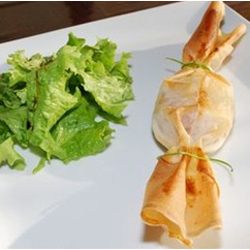 Poser une petite cuillère de pomme au centre, avec un morceau de foie gras. Saler et poivrer. Fermer les feuilles de brick comme des bonbons, en serrant les 2 extrémités avec de la ciboulette .Badigeonner de jaune d’oeuf pour faire dorer les bonbons.