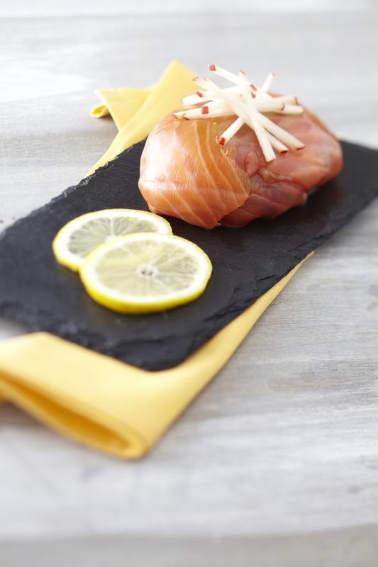 Dans un petit ramequin préalablement recouvert de film alimentaire, disposer deux tranches de saumon de manière à ce qu’elles épousent la forme du bol et dépassent de quelques centimètres.