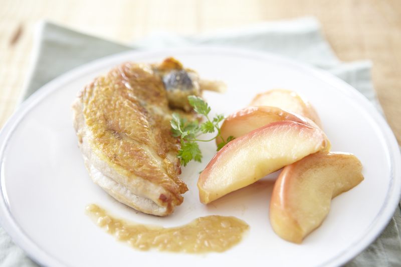 Dans une assiette, déposer un lit de pomme tiède. Ajouter un suprême dessus puis napper généreusement de sauce. Servir aussitôt.