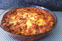 Préchauffez le four à 200°C. Dans un saladier, mélangez la farine, la levure, le sucre et la bicarbonate. Ajoutez les 2 œufs battus, l’huile d’olive et le lait. Épluchez les pommes et les coupez en lamelles très fines. Mélangez-les très rapidement dans la pâte pour qu’elles ne s’oxydent pas. Beurrez un moule à manqué de 22 cm et versez-y la préparation aux pommes. Enfournez le gâteau aux pommes pour 35 min (vérifiez la cuisson à l’aide de la pointe d’un couteau qui doit ressortir sèche). Préparez le croustillant en mélangeant l’œuf, le beurre fondu, le sucre et les amandes. Versez sur le gâteau et remettez au four pour 10 minutes.