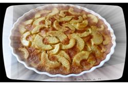 Peler les pommes et couper les en fines lamelles puis les ajouter dans la préparation et bien mélanger. Dans un moule à manqué beurré et fariné, mettre le tout.