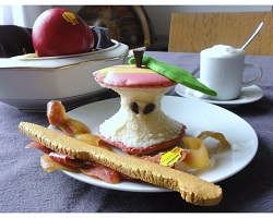Penser à réaliser au moins 6 couteaux et 6 bâtonnets en sablés au cas où il y aurait de la casse… Au moment de la cuisson des épluchures, poser le côté « fruit » vers le fond de la poêle » pour préserver la jolie couleur des pommes Ariane. Pour éviter de se lancer dans de la sculpture sur chocolat, d’autres options plus simples : une vraie queue de pomme, des raisins secs en guise de pépins et une dragée verte pour la feuille…