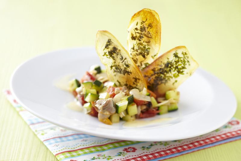 Dresser harmonieusement le croustillant de pommes de terre et les légumes.