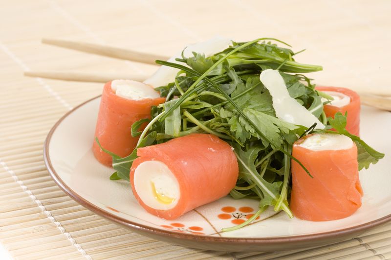 Disposer harmonieusement les makis sur une assiette, les accompagner d’un bouquet de roquette puis terminer par quelques copeaux de parmesan.