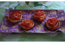 Couper en tranches les pommes avec leur peau. Les passer trois minutes au four ou au micro-onde. Découper des bandes de pâte feuilletée et sur la moitié de la bande mettre une couche de confiture. Placer les pommes dessus. Plier la bande et enrouler la avec les pommes de sorte à former une rose.