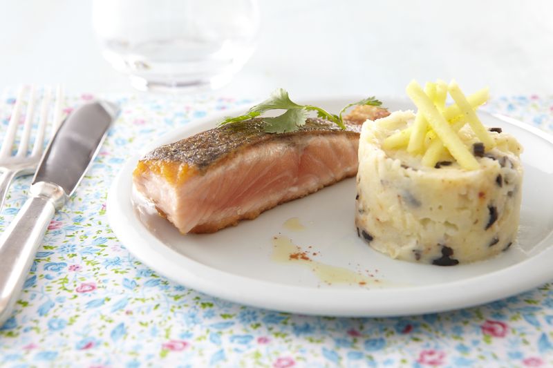 Poser l’écrasée de pommes de terre dans l’assiette à l’aide d’un cercle en inox. Placer le pavé de saumon à côté et la pomme au curry sur le dessus de l’écrasée.