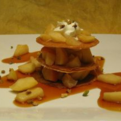Versez un peu de caramel liquide (recette ci-après), posez un cercle de brick, au dessus déposez quelques pommes, puis un autre cercle de brick, et une autre couche de pomme, terminez par un cercle de brick. Décorez avec une rosace de chantilly (recette ci-après) et des pistaches concassées.