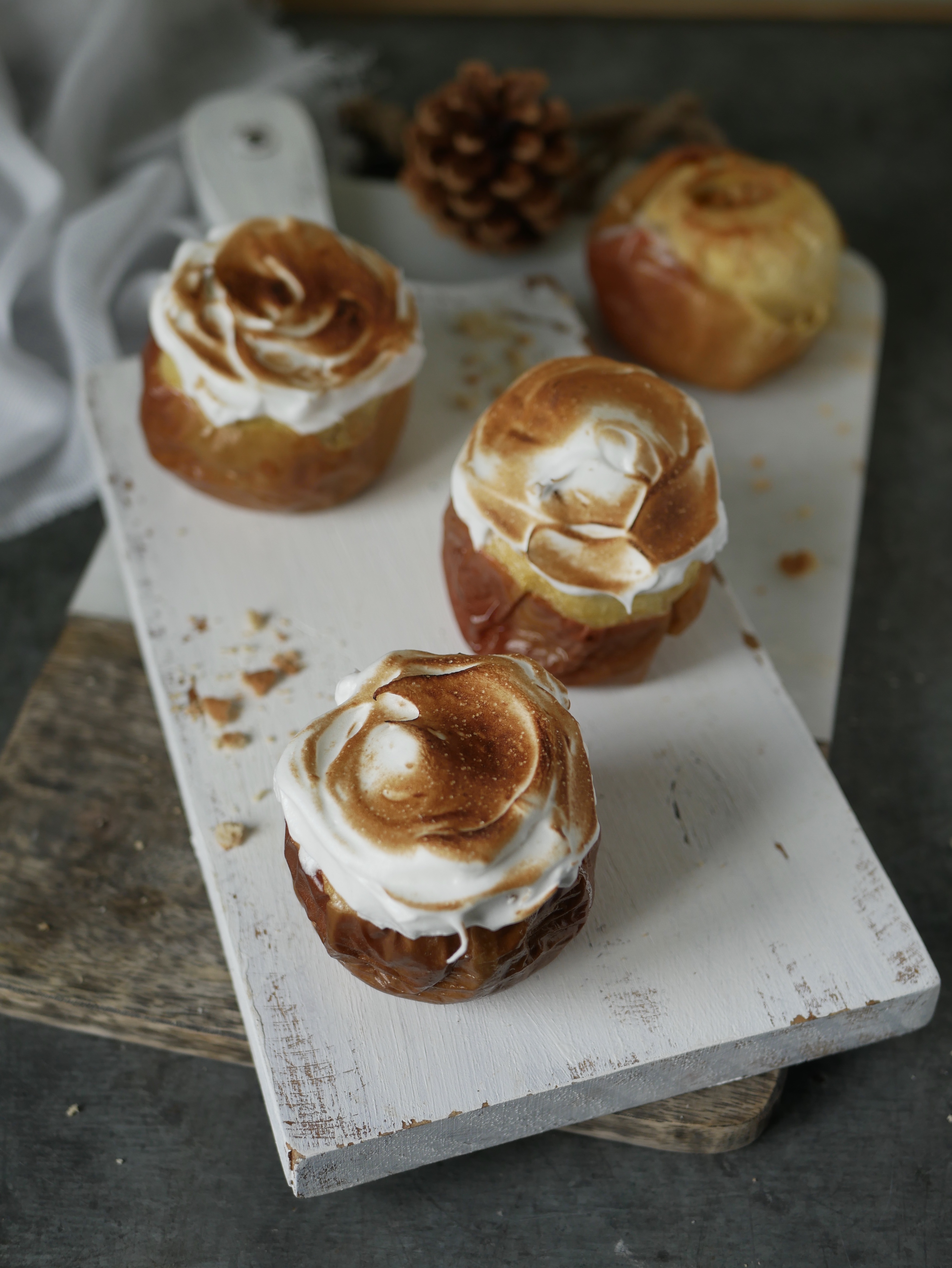 - Badigeonnez le haut de chaque pomme d’une grosse cuillère de meringue, et passez-les 2-3 min sous le gril du four ou bien bien au chalumeau.