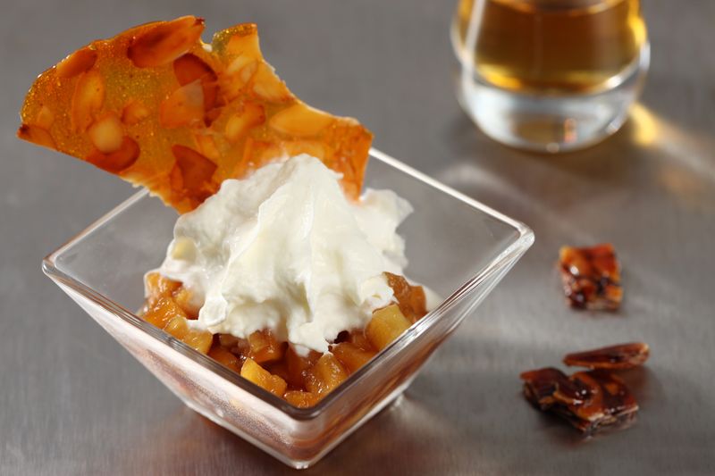 Répartir les pommes caramélisées dans une verrine, ajouter dessus l’émulsion au Calvados, puis parsemer d’éclats de nougatine.