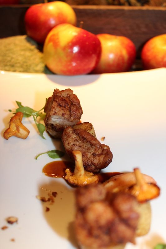 Posez-les sur la garniture de pomme de terre Ratte, girolles et pommes Ariane confites dans du beurre et du jus de pomme.
