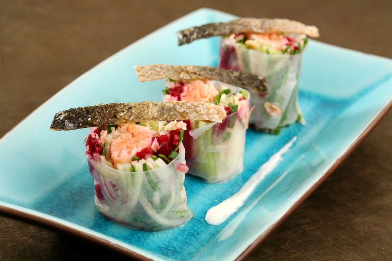 Réhydrater les galettes de riz dans un bol d’eau froide, puis les égoutter sur un linge. Sur chaque galette, disposer un tapis de julienne de légumes et saumon fumé, puis mettre la bande de saumon mi-cuit au centre. Rouler ensuite le tout à l’aide d’un tapis à maki, puis trancher en 3 comme des makis.