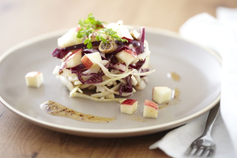 Mélanger les choux, les pommes, les figues et les pignons de pin et les assaisonner de vinaigrette.