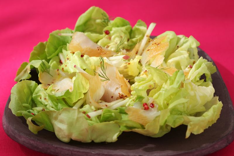 Pour le montage : dans un saladier, réunir la salade et les légumes, les assaisonner de vinaigrette moutarde et les répartir en assiettes plates. Finir avec de belles tranches de flétan harmonieusement disposées sur le dessus et les bâtonnets de pomme.
