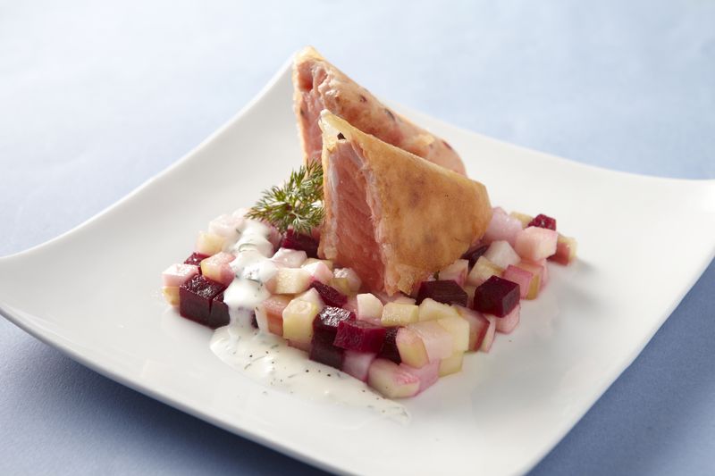Dans une assiette, déposer un lit de légumes à l’aide d’un emporte-pièce carré, puis dresser dessus les 2 demi-triangles de saumon. Terminer par un cordon de crème aigrelette.