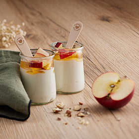 Dressez le yaourt dans les bols ajoutez une cuillère à café de sirop d’agave par bol ainsi que les pommes tranchées finement avec la peau. Parsemez de noisettes concassées.