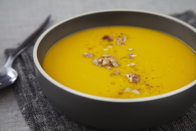 Dans une assiette creuse, déposer un fond de garniture pommes et noix puis verser la soupe chaude. Terminer par quelques gouttes d’huile de noix et quelques brisures de noix avant de déguster aussitôt.
