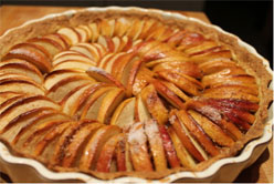 Préparer une pâte sablée, la laisser reposer au moins 30 minutes. Huiler et fariner un moule à tarte, étaler la pâte sur un plan de travail fariné, rouler la pâte sur le rouleau et la dérouler dans le moule à tarte, passer le rouleau sur les bords pour couper le superflu de pâte, piquer la pâte à plusieurs endroits et l’entreposer au frais en attendant. Couper les pommes en 4, les parer, les peler ou pas et les couper en lamelles assez fines.