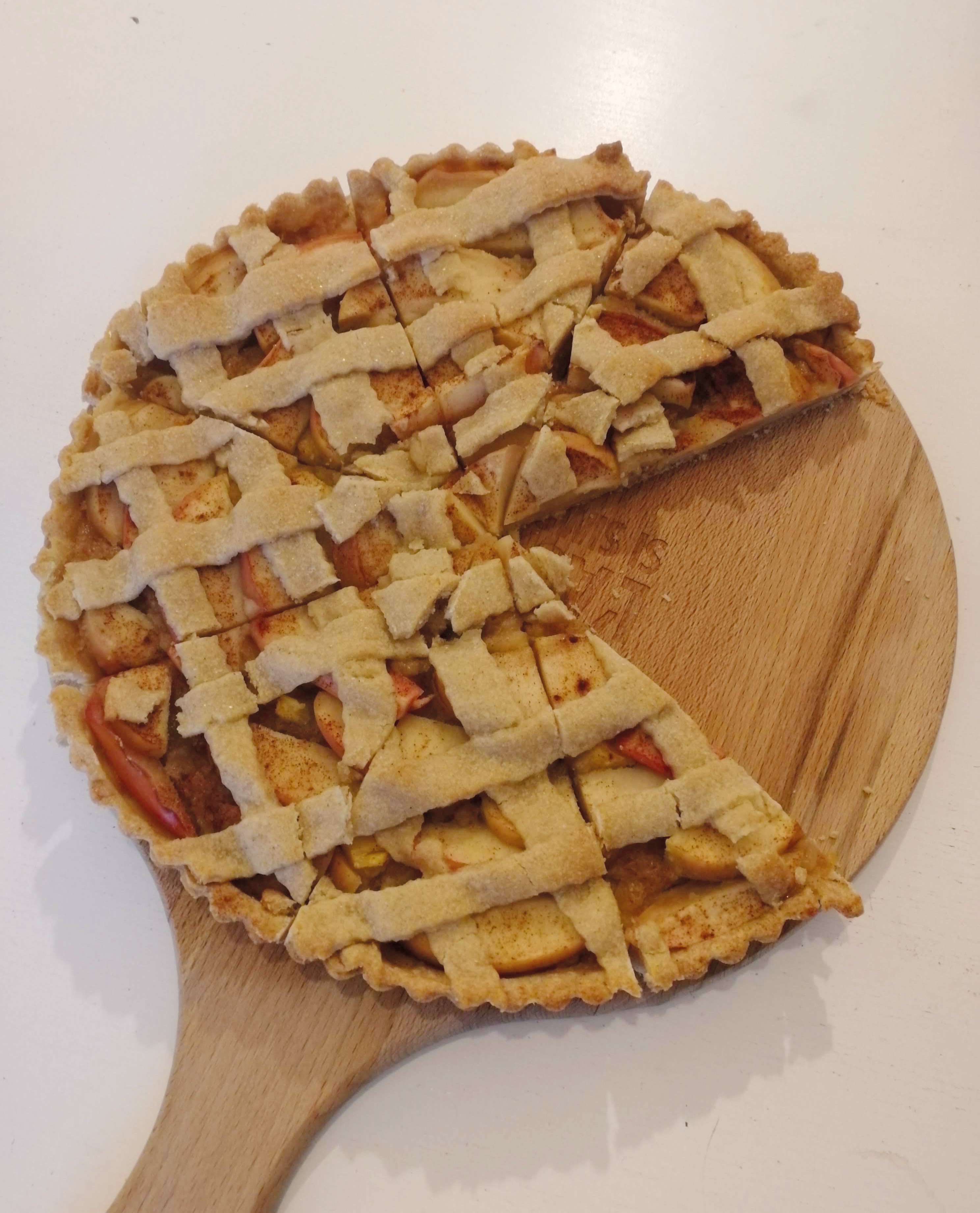 - Étaler le reste de pâte et découper des bandes pour décorer la tarte en croisillons.