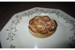 Prenez un cerclage. Étalez la pâte sablée, puis découpez vos pommes en rondelles bien fines sans les éplucher pour faire une rose à l’intérieur. Mettez-les dans le cerclage bien serrées, saupoudrez de sucre et enfournez à 180°C pendant 30 minutes.