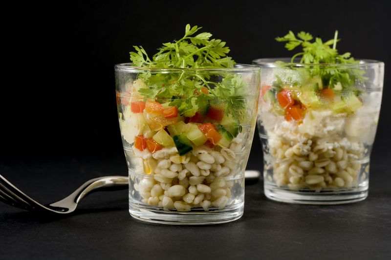 Dans une verrine, disposer du blé puis une tranche de chèvre, et recouvrir du minestrone de fruits et légumes.