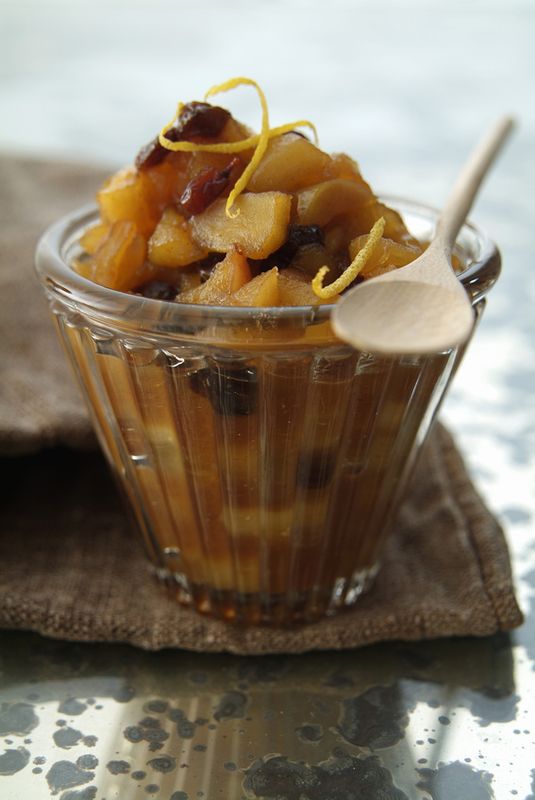 Dans une poêle froide, mettre le sucre puis le faire chauffer jusqu’à obtenir une couleur caramel. Ajouter alors les pommes et les enrober de caramel, puis ajouter les raisins et le jus de citron. Remuer délicatement et cuire doucement à couvert pendant 5 min.