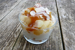 Pour le montage final : Quand les pommes sont froides, les retirer du sirop. Écraser un palet breton dans chacune des verrines aux pommes. Y ajouter 2 cuillères de fromage blanc sucré, puis répartir les morceaux de pommes. Terminer en versant 1 ou 2 cuillères de caramel au beurre salé et saupoudrer le dessert d’amandes effilées.
