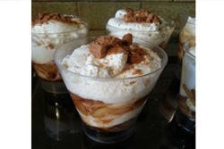Pour le dressage des verrines : déposez au fond de chaque verrine une cuillerée de spéculoos émietté,une cuillerée de pommes caramélisées,arroser d’un peu de jus de cuisson des pommes, rajouter la crème, et répétez l’opération, finir par une généreuse couche de crème à l’aide d’une poche à douille. Décorez selon vos envies. Laissez reposer 2 heures au frais. Dégustez ce délicieux dessert aux pommes !